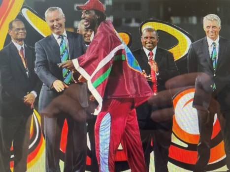 Alan Isaac trying to present the T20 Trophy to a dancing Chris Gayle.