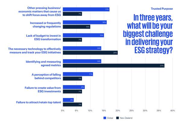 But if we consider the second-biggest challenge - technology that can measure and track ESG initiatives – the issue becomes broader and predates recent global turbulence. Based on this, 57% of New Zealand CEOs are struggling with ESG measurement in some way. Guidance is certainly a critical piece of the reporting puzzle, but developing key metrics and, more importantly, operationalising ESG plans also need the right data and capability in-house. Organisations are only just beginning to invest in data platforms needed to help collate and analyse the broad spectrum of data captured under ESG and this is likely hampering progress to date.