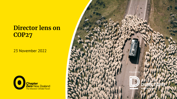 The governance implications for New Zealand were discussed by a panel of experts in a Chapter Zero webinar “Director lens on COP27”. Speaking at the event, leading directors said that increasing the engagement of New Zealand’s primary sector boards – and meeting the concerns of farmers – was likely to deliver more effective climate action in Aotearoa than what came out of the Egypt event.