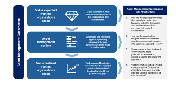 Once those first questions are on the table, directors often want a clearer sense of what effective asset governance looks like. A helpful way to think about it is to follow the path from the value the organisation expects its assets to deliver, to the systems and capability that support those assets, and then to the value that is ultimately realised.