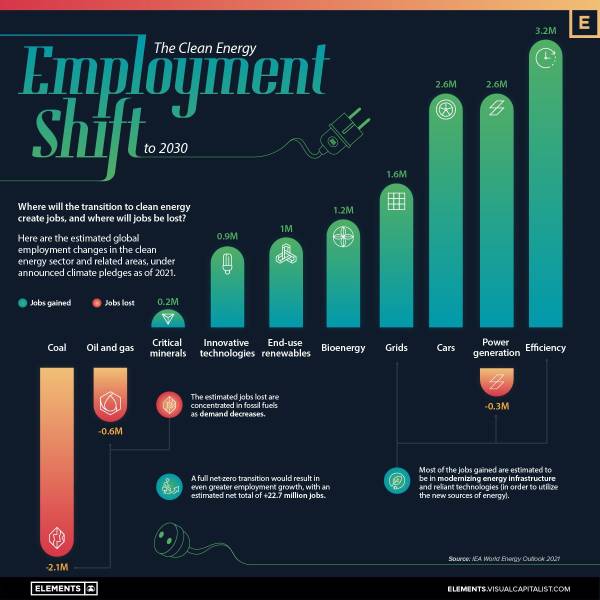 This graphic from visualcapitalist.com, shows projected global employment growth in the clean energy sector and related areas, under announced climate pledges as of 2021, as tracked by the IEA’s World Energy Outlook.