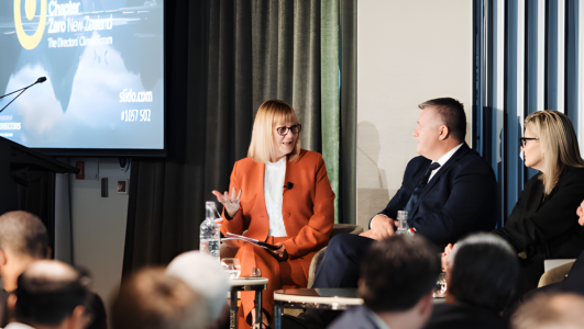 Moderator Jackie Lloyd CFInstD, a company director and President of the IoD, noted the interdependence of New Zealand companies when it comes to meeting the Government’s target – for the economy to be net zero (excluding biogenic methane) by 2050.